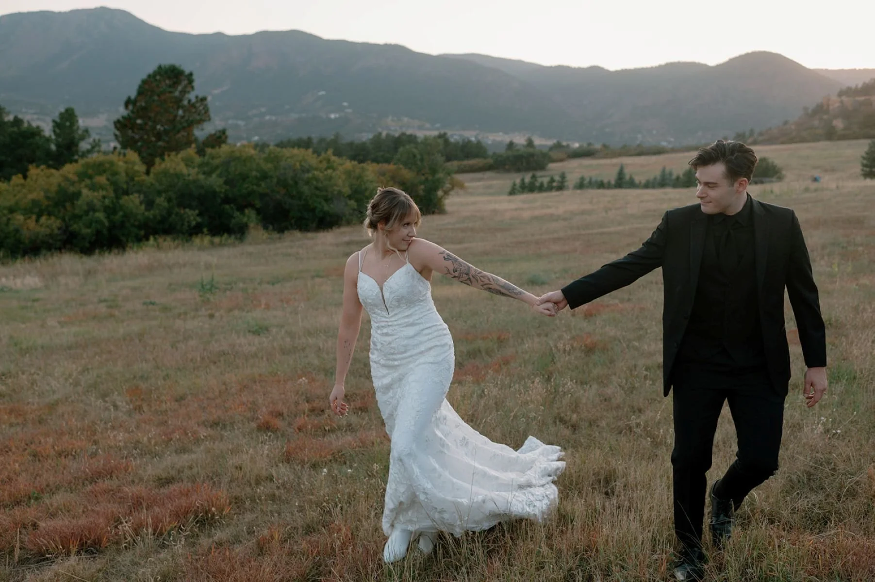 Once their ceremony was over, we headed out to a field nearby, surrounded by pine trees and mountains. We grabbed a few more couple portraits as the sun was setting. Then, they pulled out a blanket and enjoyed opening a bottle of champagne to celebrate!